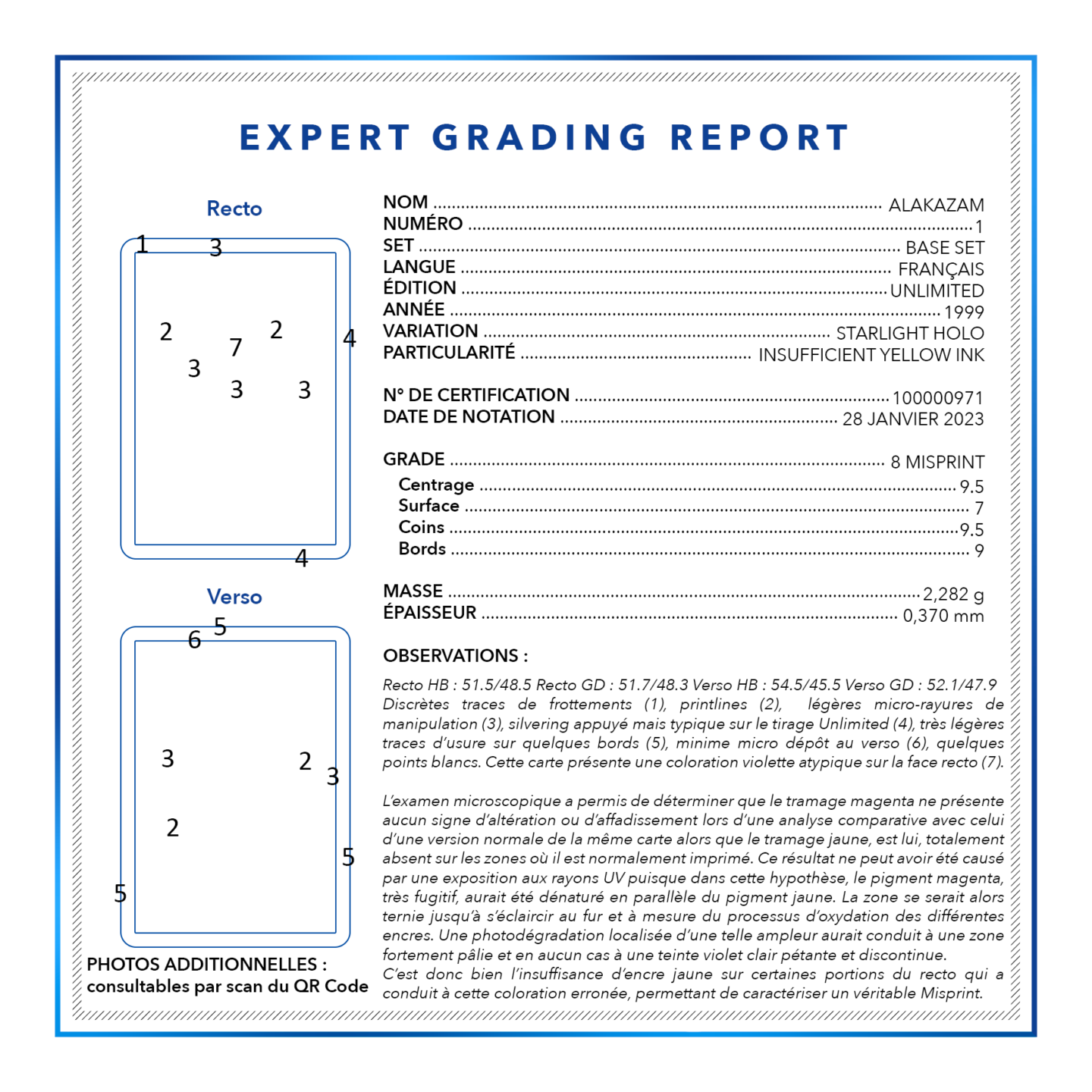 Étape cruciale de la notation, nos experts vont ensuite déterminer si votre carte est authentique. Au moindre doute, ils se livreront à un examen approfondi en analysant de nombreux détails au moyen de techniques de pointe de différentes natures :